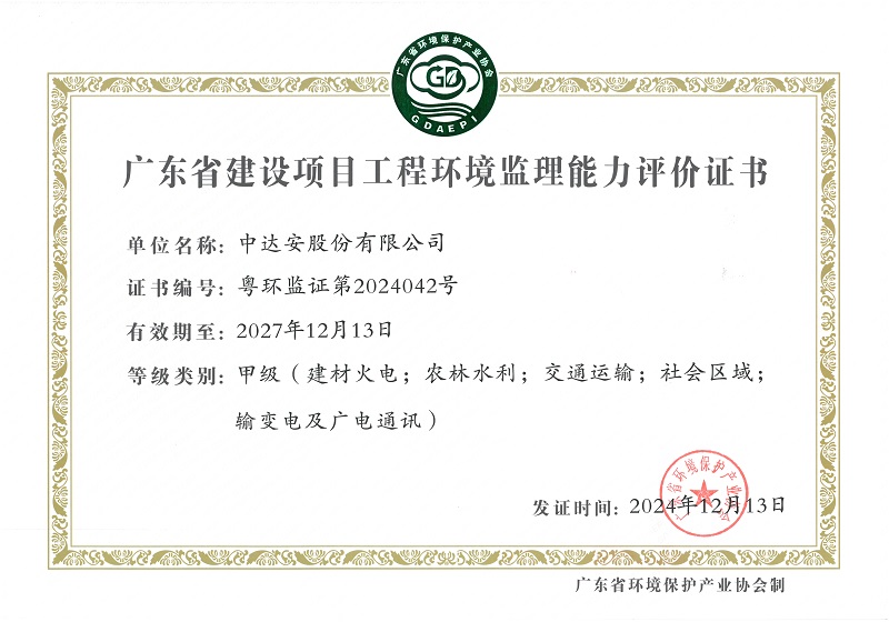 廣東省建設(shè)項(xiàng)目工程環(huán)境監(jiān)理能力評(píng)價(jià)甲級(jí)